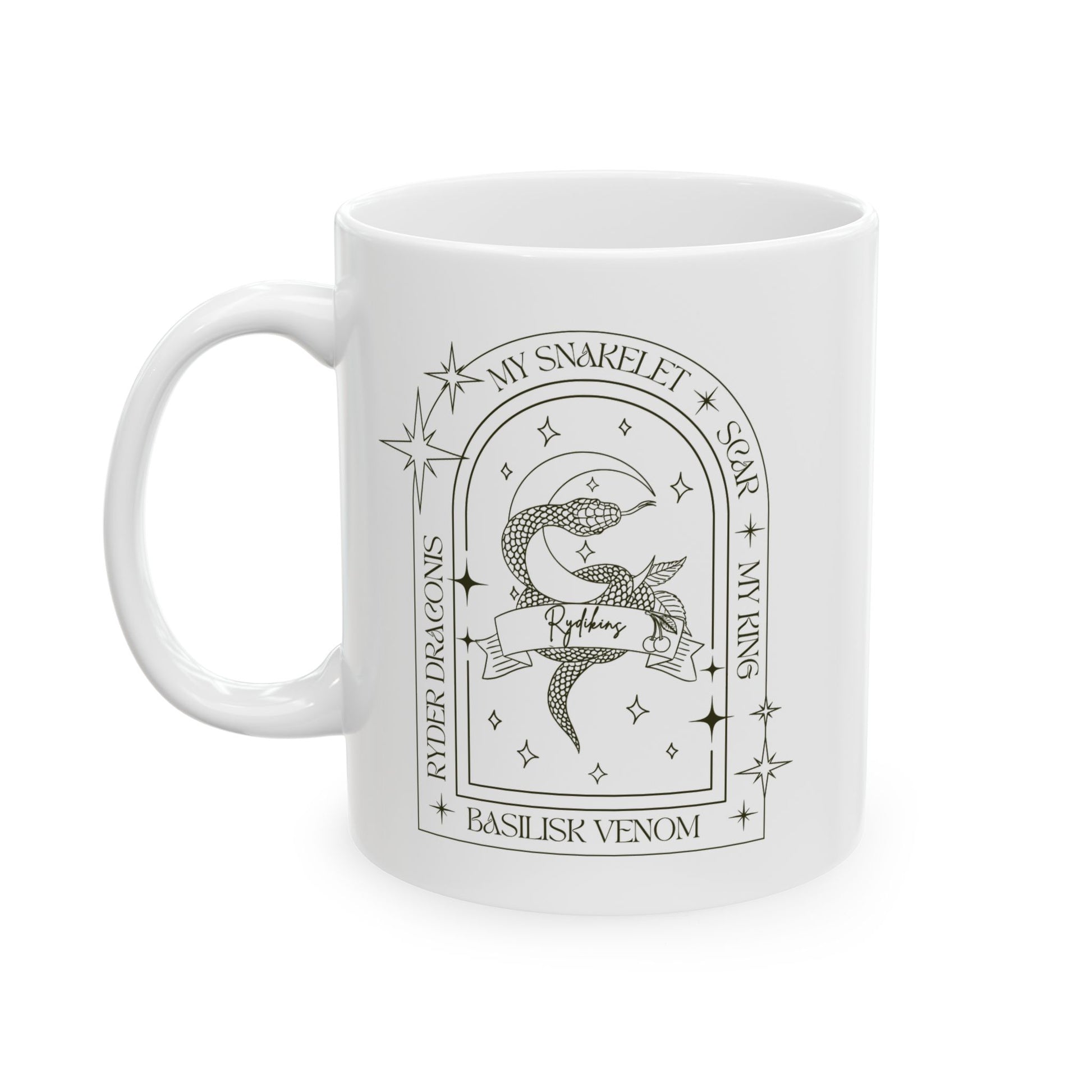 This Rydikins mug is perfect for fans of the ruthless boys of the zodiac series and Ryder draconic. The glossy black ceramic mug features vibrant colors and is available in two sizes. It is microwave and dishwasher safe, making it convenient for daily use.